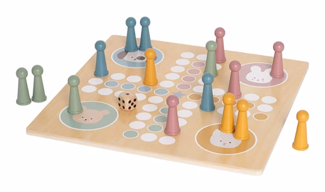 Detta fia med knuff i trä är ett klassiskt sällskapsspel där upp till fyra personer tävlar mot varandra om att först komma runt spelplanen och in i mål.
