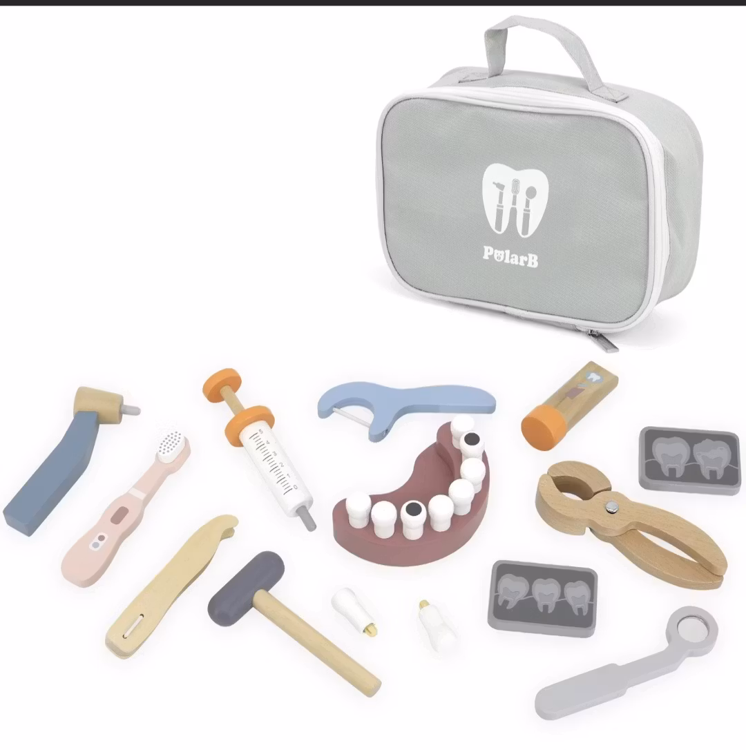 Spännande tandläkarset med tillhörande väska Kommer med alla slags tillbehör och verktyg man kan behöva för att undersöka och laga tänder. Perfekt för lek eller för att öva inför kommande tandläkarbesök.
